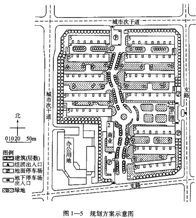 | 1.圖1-5為某市一個居住組團規劃方案,規劃用地9萬平方米,規劃住宅戶數800戶,人口約3000人。該地塊西、北臨城市次干路,東南兩側為支路,在地塊外西南角為現狀行政辦公用地。根據當地規劃條件要求,住宅建筑均為5層,層高2.8m,日照間距系數不小于1.4。該規劃方案布置了12幢住宅樓及物業管理和商業建筑;結合組團出入口安排地面和地下停車場,并有市政工程和環衛設施配套。 評析該方案,具體指出方案的主要優點和存在的問題。 ![]() |