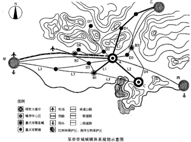 | 1.A市位于我國東南部沿海丘陵地區。北部為山區,中部為山前平原,南部為濱海平原。在周邊城鎮群中定位為濱海旅游城市。 區域概況:該市周邊分布有甲、乙、丙三個城市,其中甲市位于A市西側,距A市約200km,為我國東南部沿海重要的港口城市,并已建成國際機場一座;乙市在A市北側,距A市約140km,是我國重要的加工業產業基地;丙市為港口城市,距A市約160km。 自然條件:該市自然生態環境較好,風景旅游資源豐富,其中北部山體列入國家自然保護區,國家4A級風景旅游區;沿海地區中部海岸為約2km的平坦的沙質岸線,沙軟潮平,水質清澈,附近有海島;西部主要為礁石海岸,但水深較淺;東部沿海為我國著名的紅樹林及海洋生物保護區。 為充分發揮地域區位優勢,進一步推動A市經濟發展,根據A市在城鎮群內濱海旅游城市的定位,結合A市城市發展現狀,該市編制了以產業發展為主的市域城鎮體系規劃,如下圖所示。主要內容如下。 (1)等級結構 分為A、B、C、D四級。A為市域中心城市;C為市域副中心城市,未來城市發展區域;B為重點發展城鎮;D為一般城鎮。 (2)職能結構及產業定位 ①A為市域中心城市,是全市政治、經濟、文化中心。 ②C市為現狀縣城,擬作為未來城市的副中心,為未來城市發展方向,定位為縣級市,建設新型工業區,并布局大型區域電廠(裝機容量480×10 kW)一座。③B1、B2、B3為現狀縣城,擬作為重點發展市域副中心城市,其中B1定位工業型城市,并擬建設大型深水碼頭;B2定位商貿城市;B3擬建設為東南地區重要的加工制造基地。 ④D1為重點旅游城鎮,為旅游集散中心,D2、D3、D4、D5重點發展工業。 (3)交通規劃 ①為把該市建設成重要的港口城市,擬在B1進行建設深水港碼頭。 ②考慮到A市現狀基礎設施和城鎮依托條件較好,擬定于市域西側建設機場。 ③為促進區域協調發展規劃完善道路交通體系網,擬加快環形公路網建設,重點建設L1、L2、L3三條道路,其中L1為連接B1、A及D1的高速公路,L2為B2、A及C的高速公路,L3為連接甲、B1及C的濱海道路,以加強各城鎮之間的聯系。 請指出:該規劃在區域協調發展、城鎮及產業布局、交通等方面中的不合理之處,簡要提出改進意見。 ![]() |