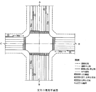 3.圖為某城市新區主干路AB與次干路CD交叉口規劃平面圖。規劃主干路AB的橫斷面為雙向6條機動車道三塊板布置,次干路CD的橫斷面為雙向4條機動車道一塊板布置。交叉口設置了5個公交停靠站,其中②、③、⑤號站為直行、右轉公交站,①、④號站為左轉公交站,停靠站距交叉口距離如圖所示。試指出該交叉口規劃平面布置存在的問題。![]() |