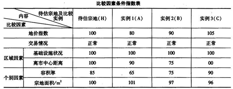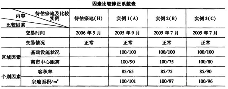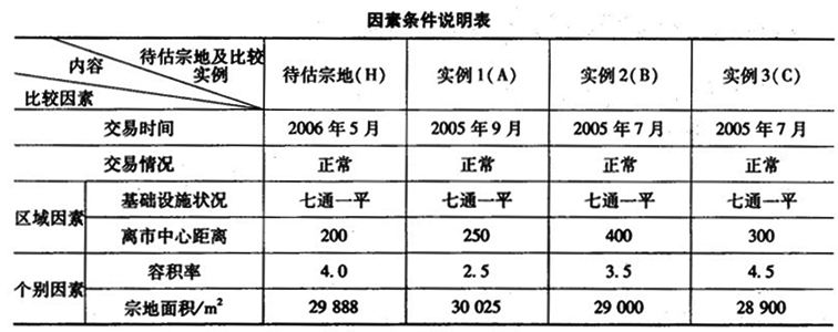 | 3.下面是一個完整的土地估價技術報告(標注“略”的為正常內容),請閱讀后指出錯誤點并說明原因(每指出一處錯誤并簡述原因的得1.25分,只指出錯誤不簡述原因的不得分,總分最高為30分)。 土地估價技術報告 第一部分總述 一、估價項目名稱 ××××地價評估。 二、委托估價方 ××××市新區塑料建材廠(其他略)。 三、受托估價方 ××××市地產評估咨詢中心(其他略)。 四、估價對象 本項評估是對××××市新區塑料建材廠所占宗地的地價評估。 五、估價目的 本報告為××××市新區塑料建材廠抵押貸款提供地價依據。 六、估價依據 (略)。 七、地價定義 50年土地使用權的現實市場價格。 八、估價期日 2006年5月20日-6月1日。 九、估價日期 2006年5月31日。 十、估價結果 總地價:1551.88萬元。 單位地價:519元/m 。樓面地價:1174元/m 。評估價格貨幣種類:人民幣。 十一、需要特殊說明的事項 (1)此項評估是評估期日的價格現值,假設在此期間物業價格值保持穩定。 (2)本報告只為××××塑料建材廠抵押貸款提供地價依據,未探討用于其他方面的可行性。 (3)樓房沒有進行結構測試和檢驗設施,因此不能確定其設施的完備性。 (4)報告之中有關證明材料由當事人提供。 (5)本報告有效期為半年。 (6)本報告全文或部分內容公布之前,需征得本中心同意,國家法律規定者除外。 十二、土地估價人員 ×××經濟師 ×××工程師 二00六年六月八日 第二部分估價對象描述及地價影響因素分析 一、估價對象描述 1.土地位置狀況 待估宗地位于××××市新區××××號,屬工業用地,宗地四至東為×公司,西為×路,南為×道,北為×廠。占地面積29887.5m ,土地級別屬于二級甲。“國家建設用地使用證”證號為:××國用(2006)字第××號。2.土地權利狀況 該宗地以劃撥方式取得土地使用權,使用期限為50年,剩余45年,已使用5年,該單位享有土地的抵押權、擔保權、租賃權等他項權利,地上附著物及建筑物所有權歸××塑料建材廠。 3.建筑物和地上附著物狀況 ××塑料建材廠除辦公樓四層外,其他兩座廠房、傳達室等土地附著物均為平房,磚混結構,耐用年限30年,建筑面積13217.39m ,均為水泥地面,內墻為涂料粉刷,外墻水掃石裝飾,建筑高度12m,門窗均為塑鋼材料。二、地價影響因素分析 1.一般因素 ××塑料建材廠歷年來為新區支柱企業。近年來,由于受市場影響,效益開始滑坡,經營處于低谷,導致該廠負擔沉重,資金較為緊張,影響了發展,職工工資連續3個月沒有兌現。根據國家有關政策,該企業已經轉變經營機構,正在新上國家級項目。 2.區域因素 該宗地土地級別為二級甲工業用地,但交通條件較優越,新城道為城市生活型主干道,有通往市區和外縣的公共汽車,各種建筑均符合規劃要求。商業、服務業基本配套,環境有輕度污染,市政設施良好,上水、排水與區主干線連接,供電有保障。通信線路與市區電話聯網,可以全國直撥。供暖為統一供熱,是較為理想的工業用地。 3.個別因素 該宗地用地規劃、綠化、美化較好,有花窖一座,道路都已硬化,布局合理,公用設施配套,最有效用途為工業,實際用途與最有效用途一致。宗地的寬度、進深、形狀等對工業用地沒有影響。按照區規劃要求,地上容積率為0.5~4。 第三部分土地估價 一、估價原則 1.主要遵循替代原則,可概括如下。 (1)土地價格水平由具有相同性質的替代性土地的價格所決定。 (2)地價水平是由最了解市場行情的買賣者按市場的交易案例相互比較后所決定的價格。 (3)土地價格可通過比較地塊的條件及使用價值來確定。 2.最有效利用原則 由于土地具有用途的多樣性,不同的利用方式能為權利人帶來不同的收益量,且土地權利人都期望從其所占有的土地上獲取更多的收益,并以能滿足這一目的為確定土地利用方式的依據。 3.上述原則加上多種評估方法綜合分析、判斷等,以體現客觀、公正、科學、合法性。 二、估價方法與估價過程 依據文件有關規定,宗地地價評估選用兩種方法以上同時測算,綜合分析確定最終地價。 根據評估對象的實際情況,以市場比較法和基準地價系數修訂法進行評估。 1.市場比較法 (1)比較實例選擇:現收集到與待估宗地(H)條件類似的A、B、C三宗案例進行比較,其因素條件說明見下表。 ![]() (2)因素選擇(見下表)。 ![]() (3)因素條件說明(見下表)。 ![]() (4)實例修正后的地價計算。 ![]() ![]() ![]() (5)評價宗地(H)的地價。 (H)=(A+B+C)/3=(597.08+510.29+414.80)/3=507.39(元/m )總地價=507.39×29887.5=1516.46(萬元) 樓面地價=15164600/13217.39=1147.32(元/m )2.基準地價系數修訂法 依據《××××市國有土地使用權出讓金和級差地租收取標準》,確定委估地塊位于××××市新區中心東部,屬二級甲,基準地價18.9萬元/畝,估價對象土地用途為工業用地,年限修正系數為0.991,期日修正為系數5%,綜合因素修正系數為9.4%,按新區規劃辦要求,待估宗地容積率為1.8,即可求得宗地地價,系數修訂公式為: ![]() 式中P -待估宗地地價;P-待估宗地對應的基準地價; Y-年限修正系數; K-綜合因素修正系數和; T-期日修正系數; -容積率修正系數。單位地價=18.9×(1+9.4%)×0.991×(1+5%)×1.8 =531.09(元/m )總地價=531.09×29887.5=1587.3(萬元) 樓面地價=15873000/13217.39=1200.92(元/m )三、地價的確定 1.地價確定的方法 選取市場比較法、基準地價系數修訂法求取委估地塊地價,結果非常接近,無實質性差異,故取兩種結果的算術