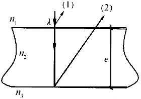 4.如圖所示,折射率為n 、厚度為e的透明介質(zhì)薄膜的上方和下方的透明介質(zhì)的折射率分別為n 和n ,已知n <n <n 。若用波長為λ的單色平行光垂直入射到該薄膜上,則從薄膜上、下兩表面反射的光束(1)和(2)的光程差是( )。 |