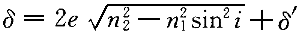 正確答案:A 解題思路:【解析】由從薄膜上、下兩表面反射的光束(1)和(2)的光程差是δ=2n e![]() 【點評】薄膜干涉光程差的公式為: ![]() 上式中i為單色平行光入射到薄膜的入射角,e為介質(zhì)薄膜厚度。n 、n 、n 分別為薄膜的上方、薄膜、薄膜下方介質(zhì)的折射率,δ′為半波損失項,或叫附加光程差。當單色平行光垂直入射到薄膜上,入射角i=0,則從薄膜上、下兩表面反射的光束(1)和(2)的光程差是:δ=2en +δ′半波損失項δ′的判定是正確做題的關鍵。式中附加光程差δ′的討論是非常有意義的,在實際計算中也是非常重要的。δ′是這樣確定的:(1)光只發(fā)生了一次反射,是在上表面即由介質(zhì)(n )入射到薄膜表面的反射,有半波損失;(2)光也有一次反射,是在下表面即由薄膜入射到介質(zhì)(n )表面的反射,沒有半波損失;故總共只有一個半波損失,即δ′=λ/2(或?qū)憺?delta;′=-λ/2,兩種寫法不影響明暗條紋的位置)。若都有半波損失或都沒有半波損失,則δ′=0。更一般地講,薄膜干涉可能涉及三種不同的介質(zhì)n 、n 和 ,從介質(zhì)的折射率大小的排列來看,有兩種可能的方式。一種是按n >n <n 或n <n >n 的順序排列,即薄膜的折射率大于或小于它兩面介質(zhì)的折射率。此時對反射光干涉δ′=λ/2,另一種是n > >n 或n <n <n 的排列順序,即薄膜折射率的大小,在它兩面的介質(zhì)折射率的大小之間。例如水面上的油膜,鏡頭上的保護膜都屬于這種情況。這時對反射光干涉附加光程差為δ′=0。 |