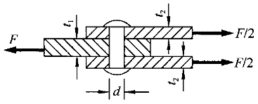 2.如圖所示軸向受力鋼構件采用鉚連接,已知構件厚度t =14mm,t =8mm,鉚釘的直徑d=20mm,鉚釘的許用應力為[σ ]=200MPa,[τ]=120MPa,則該連接所能承受的最大拉力為( )。![]() |