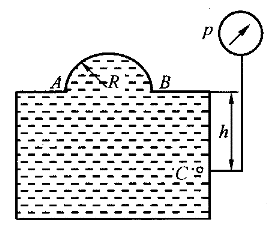 3.如圖所示貯水設備,在點C測得絕對壓強p=196120Pa,h=1m,R=1m,則作用在半球AB上的靜水總壓力為( )。![]() |