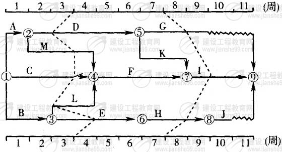 C.工作箭線中實線部分的水平投影長度表示該工作的持續時間