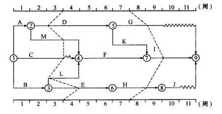 | 正確答案:CDE 解題思路:第3周末檢查時工作D拖后1周,但工作D是關鍵工作,所以會影響總工期,工作L拖后1周,工作L也是關鍵工作,也會影響總工期,選項A和B是錯誤的;第7周末檢查時,工作I提前2周,因其為關鍵工作,可能會縮短工期2周,工作G提前1周,因其不是關鍵工作,不會影響總工期,選項C和D是正確的;第4周至第7周內的時間為4周,工作E和工作H的實際進度也是4周,選項E正確。 |