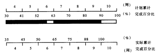 | 2.當采用非勻速進展橫道圖比較工作實際進度與計劃進度時,如果同一時刻橫道線上方累計百分比大于橫道線下方累計百分比,表明( )。 |