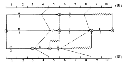 8.某分部工程時標網絡計劃如下圖所示,當設計執行到第4周末及第8周末時,檢查實際進度如圖中前鋒線所示,該圖表明( )。![]() |