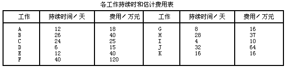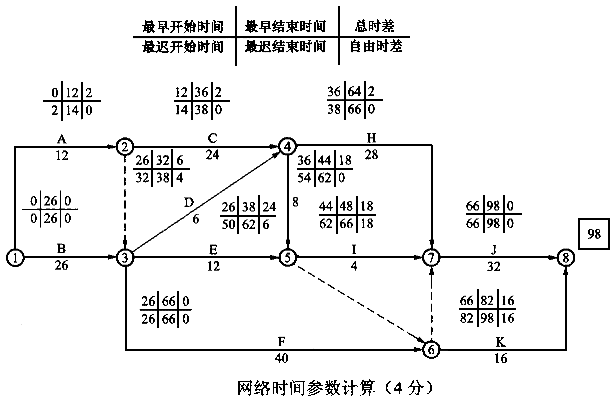 | 正確答案: 1.在圖3.4上計算時間參數。 關鍵路線:①-③-⑥-⑦-⑧ (或關鍵工作為B、F、J;或在圖中直接標出) 工期:98天(或在圖中標出) ![]() 2.計算綜合費用如下。 原始方案估計費用: 18+40+25+15+40+120+16+37+10+64+16=401萬元 延期罰款:5×(98-93)=25萬元 綜合費用為:401+25=426萬元 3.調整優化工期如下。 第一次調整優化:在關鍵線路上取壓縮單位時間增加費用最低的F工作為對象壓縮2天。 增加費用:2×2=4萬元 第二次調整優化:工作A、C、H、J與工作B、F、J同時成為關鍵工作,選擇工作H和工作F為調整對象,各壓縮2天。 增加費用:2×(1.5+2)=7萬元 第三次調整優化:工作A、C、H、J與工作B、F、J仍為關鍵工作,選擇工作A和工作F為調整對象,各壓縮1天。 增加費用:1×(2+2)=4萬元 優化后的關鍵線路為: ①-③-⑥-⑦-⑧(或關鍵工作為工作A、C、H、J) 和①-②-④-⑦-⑧(或關鍵工作為工作B、F、J) 工期:98-2-2-1=93天 最低綜合費用:401+4+7+4=416萬元 |