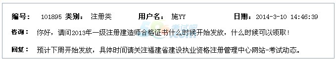 2013年福建一級建造師考試合格證書預計將于2014年3月17日后發放,具體信息可關注福建建設執業資格注冊管理中心