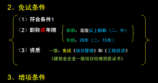 凡2003年12月31日前取得建設部頒發的《建筑業企業一級項目經理資質證書》,并符合下列條件之一的人員,可免試《建設工程經濟》和《建設工程項目管理》2個科目。