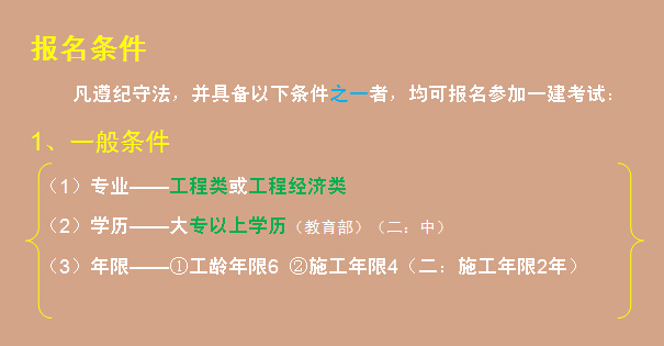 1、取得工程類或工程經濟類大學??茖W歷,工作滿6年,其中從事建設工程項目施工管理工作滿4年。