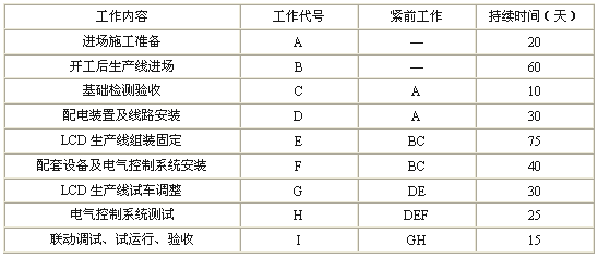 | 3.背景資料 南方電子電氣有限公司(建設單位)新建液晶屏(LCD)生產(chǎn)車間,其生產(chǎn)線由建設單位從國外訂購,A施工單位承包安裝。A施工單位進場時,生產(chǎn)車間的土建工程和機電配套工程(B施工單位承建)已基本完工。A施工單位按合同工期要求,與建設單位、生產(chǎn)線供應商和B施工單位洽談,編制了LCD生產(chǎn)線安裝網(wǎng)絡計劃工作的邏輯關(guān)系及工作持續(xù)時間表(見下表)。 ![]() LCD生產(chǎn)線安裝網(wǎng)絡計劃工作邏輯關(guān)系及持續(xù)時間表 A施工單位在設備基礎檢驗時,發(fā)現(xiàn)少量基礎與安裝施工圖不符,B施工單位進行了整改,重新澆搗了混凝土基礎,經(jīng)檢驗合格,但影響了工期,使基礎檢驗持續(xù)時間為30天。LCD生產(chǎn)線的安裝正值夏季,由于臺風影響航運,使LCD生產(chǎn)線設備到達安裝現(xiàn)場比計劃晚7天。A施工單位按照建設單位的要求,調(diào)整進度計劃,仍按合同規(guī)定的工期完成。 問題 1.按LCD生產(chǎn)線安裝網(wǎng)絡計劃工作的邏輯關(guān)系及工作持續(xù)時間表為A施工單位項目部繪出安裝進度雙代號網(wǎng)絡計劃圖。 2.分析影響工期的關(guān)鍵工作是哪幾個?總工期需多少天? 3.基礎檢驗工作增加到30天,是否影響總工期?說明理由。 4.LCD生產(chǎn)線設備晚到7天,是否影響總工期?說明理由。 5.如按合同工期完成,A施工單位如何進行工期調(diào)整? |