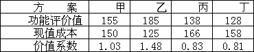 1.運用價值工程優(yōu)化設計方案所得結果是:甲方案的功能評價值155,現(xiàn)實成本150萬元;乙方案的功能評價值185,現(xiàn)實成本125萬元;丙方案的功能評價值138,現(xiàn)實成本166萬元;丁方案的功能評價值128,現(xiàn)實成本158萬元。評價對象價值最佳的為