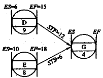 | 正確答案:C 解題思路:本題主要考查搭接網絡圖中各種搭接關系的含義和最早開始時間的計算。STF為開始到結束的時間間隔;STS為開始到開始的時間間隔。由D和G的關系可知,G最早開始時間為6+12-4=14天;由E和G的關系可知G的最早開始時間為10+6=16天,所以二者取大為16天。 |