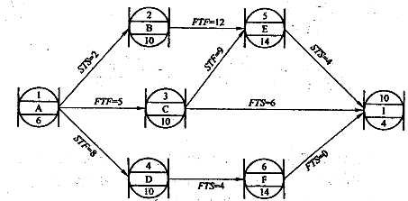 | 正確答案:B 解題思路:本題主要考查搭接網絡圖中各種搭接關系的含義和最早開始時間的計算。STF為開始到結束的時距,由工作D和G的關系可知,工作G最早開始的時間為6+12-4=14天。 |