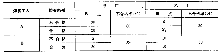 | 正確答案:B 解題思路:焊接工人A用乙廠生產(chǎn)的焊條焊接的總點數(shù)為6/0.3=20,合格的點數(shù)X1=20-6=14,焊接工人B用甲廠生產(chǎn)的焊條焊接的不合格率X2=5/(5+20)=20%。故本題正確答案為B |