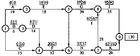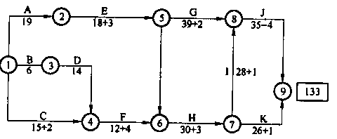 1.南方某水泥廠機電工程建設項目,業主通過招標投標決定由華南安裝公司承接該工程,華南安裝公司與業主簽訂了工程合同。合同工期為130天,合同規定:工期提前一天獎勵5000元,每拖后一天罰款5000元。通過雙方協調編制了如下圖所示的網絡計劃,經業主同意后實施;計劃執行過程中,出現了下列一些情況;![]() (1)因業主不能及時供應設備,使E延誤3天,C延誤2天,H延誤3天 (2)因機械發生故障檢修,使G延誤2天,K延誤1天 (3)因土建設備基礎孔偏移問題,使F延誤3天 (4)因公網停電,使F延誤一天,1延誤1天 (5)安裝單位在J施工過程中采取了加快施工的技術措施,業主付給安裝單位技術措施費1萬元,使J施工時間縮短了4天 問題: (1)施工單位就上述5種情況中哪些內容可以向業主提出工期補償? (2)指出關鍵線路? (3)該工程的實際工期為多少天? (4)可順延工期為多少天? (5)安裝單位得到的提前獎是多少? |