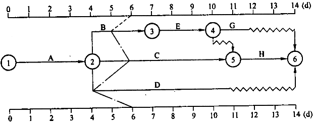 10.某分部工程雙代號時標(biāo)網(wǎng)絡(luò)計劃執(zhí)行到第6d結(jié)束時,檢查其實(shí)際進(jìn)度如下圖前鋒線所示,檢查結(jié)果表明( )。![]() |