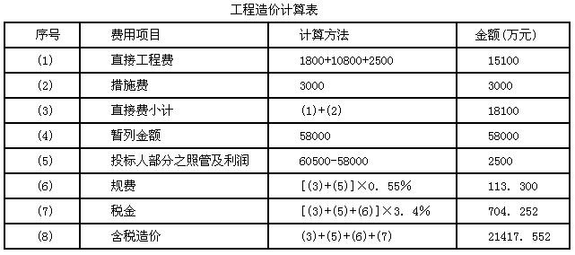 | 11.【案例3】 某酒店工程,建筑面積為67000m ,為鋼筋混凝土框架一剪力墻結構,其各項投標價目為:措施項目:3000萬元;土方工程:1800萬元;建筑工程:10800萬元;室外工程:2500萬元;其他項目為60500萬元(其中暫列金額為58000萬元);規費費率按規定為0.55%;稅金按國家規定取3.4%。 問題: 1.請簡述直接費、間接費、規費和稅金的構成。 2.請簡述其他項目的清單構成。 3.當以直接費為計算基礎時,請列表計算該項目的建安工程造價(保留到小數點后三位)。 |