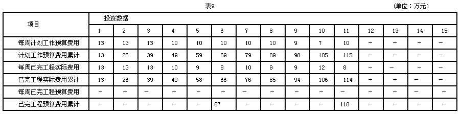 | 正確答案: (1)第6周末、第11周末的實際進度前鋒線如圖8所示。 ![]() (2)該項目第1周到第11周末費用數據統計見表9。 ![]() (3)費用偏差=已完工作預算費用(掙得值)-已完工作實際費用 第6周末費用偏差=67-66=1萬元,即費用節約1萬元 第11周末費用偏差=118-114=4萬元,即費用節約4萬元 費用績效=已完工作預算費用/已完工作實際費用 第6周末費用績效=67166=1.015,說明費用節約 第11周末費用績效=1181114=1.035,說明費用節約 (4)進度偏差=已完工程預算費用-計劃工作預算費用 第6周末進度偏差=67-69=-2萬元,即進度拖延2萬元 第11周末進度偏差=118-115=3萬元,即進度提前3萬元 進度績效=已完工作預算費用,計劃工作預算費用 第6周末進度績效=67169=0.971,說明進度拖延 第11周末進度績效=1181115=1.026,說明進度提前 |