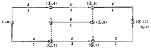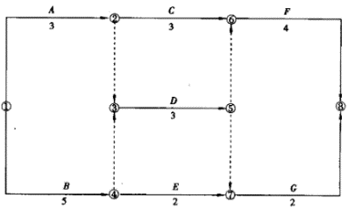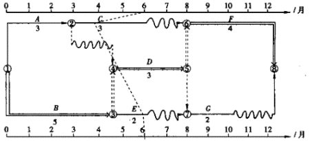8.已知某雙代號網絡圖如圖所示,合同工期為12個月,當施工單位按照該進度計劃施工到第6個月時,經檢查發(fā)現(xiàn)工作A、B已經完成,工作C進行了1個月,工作D沒有進行,工作E進行了1個月。