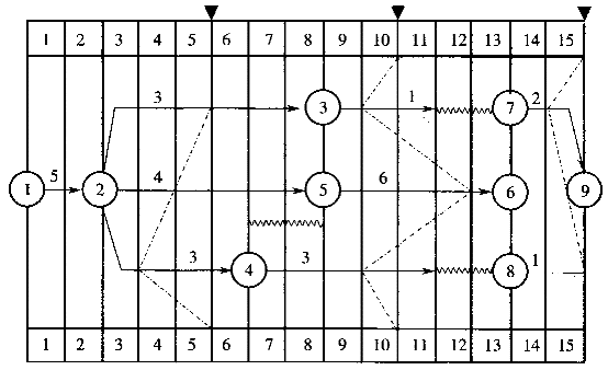 某工程的時標網絡計劃如圖1所示。工程進展到第5、第10和第15個月底時,分別檢查了工程進度,相應地繪制了三條實際進度前鋒線,如圖1中的點劃線所示。問題: