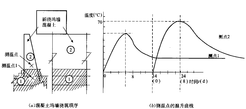 如下圖中圖(a)所示,塢墻與底板混凝土分兩次澆筑,問歇期14d,測點1、測點2的溫升曲線如圖(b)所示。![]() 問題: |