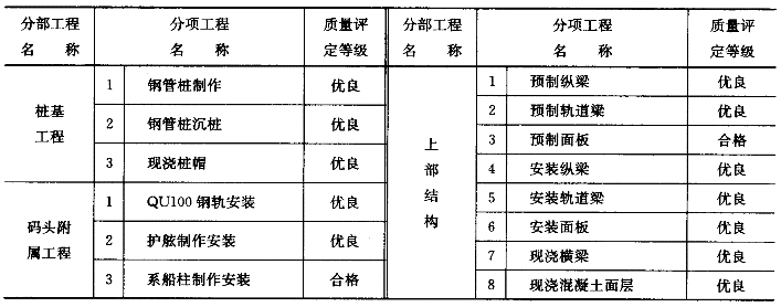 | 11.某集裝箱碼頭工程,設(shè)計為一個泊位,為高樁梁板式結(jié)構(gòu)。本工程共劃分為1個單位工程、3個分部工程、14個單項工程。工程已竣工,單位工程的質(zhì)量檢驗資料基本齊全,外觀質(zhì)量的觀感評分得分率為91.6%;各分項工程的質(zhì)量評定等級見下表:問題: (1)請指出本工程的主要分部工程。 (2)請指出本工程的主要分項工程。 (3)對3個分部工程的質(zhì)量等級進行評定。 (4)根據(jù)背景材料和分部工程的質(zhì)量等級評定結(jié)果,判斷本單位工程的質(zhì)量等級是否符合優(yōu)良標準?為什么? ![]() |