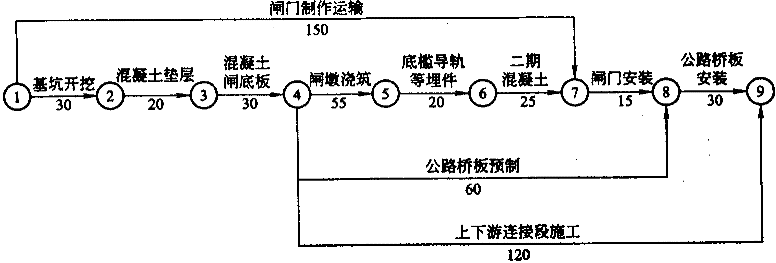 | 正確答案: (1)計(jì)劃工期為225天,關(guān)鍵線路為①→②→③→④→⑤→⑥→⑦→⑧→⑨。 (2)事件1責(zé)任方為業(yè)主,因"基坑開挖"為關(guān)鍵工作,故影響計(jì)劃工期10天。 事件2責(zé)任方為施工單位,因"閘墩澆筑''為關(guān)鍵工作,故影響計(jì)劃工期5天。 事件3責(zé)任方為施工單位,因"閘門安裝"為關(guān)鍵工作,故影響計(jì)劃工期2天。 事件4責(zé)任方為業(yè)主,因"上下游連接段施工"為非關(guān)鍵工作,原有總時差25天,故不影響計(jì)劃工期。 (3)該項(xiàng)目的實(shí)際工期為234天,應(yīng)獲得10天的工期補(bǔ)償,可獲得工期提前獎勵為10000元。 |