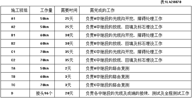 1.某項目經理部負責本地網直埋光纜線路環網工程的施工,合同規定采用包工不包料的形式承包,工程的路由報建工作已由建設單位完成,工程于4月15日開工,工期37天。該工程包括三個中繼段,其中A中繼段為50km,B中繼段為60km,C中繼段為70km,三個中繼段構成一個環形網。項目經理部將各中繼段均分為兩個作業組,在各中繼段進行流水作業。各段的作業組中,1組負責挖溝及障礙處理,2組負責放纜、回填及標石的埋設,各組的日進度均為2km。三個中繼段的路由復測工作分別由TA、TB、TC三組完成。規定光纜盤長為2km。項目經理部只有一套測試儀表及一臺熔接設備,三個中繼段的接續測試工作由D組負責完成。各中繼段的竣工資料整理工作包含在施工過程中完成,不再單獨安排時間編制。各組的工作量、完成時間以及需完成的工作如表1L420070所示。![]() 問題 (1)背景中提到的各項工作的工作順序應如何排列? (2)光纜接頭和成端接續兩項工作哪項應先完成?為什么? (3)項目經理部在此項目施工計劃中是如何進行工作分解的? (4)此工程項目經理部采用流水作業法合適嗎?為什么? (5)在考慮工序搭界的情況下,如果要求工期最短(時間按整天考慮)、費用最低,請繪制此工程包含放纜回填及埋設標石、路由復測、接續及測試、挖溝及障礙處理的橫道圖。 (6)影響本工程進度的因素可能有哪些? (7)在施工過程中,項目經理部應如何控制工程進度? (8)如果進度延誤,項目經理部應如何對工程進度進行調整? |