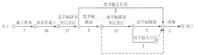 某沿海城市道路改建工程4標段,道路正東西走向,全長973.5m,車行道寬度15m,兩邊人行道各3m。與道路中心線平行且向北4m,需新建DNS00mm雨水管道973m。新建路面結構為150mm厚礫石砂墊層,350mm厚二灰混合料基層,80mm厚中粒式瀝青混凝土,40mm厚SMA改性瀝青混凝土面層。合同規定的開工日期為5月5日,竣工日期為當年9月30日。