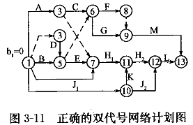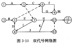 | 1.【背景材料】 某網絡圖有A~M共13項工作,其中的工作K是J的前一時段的緊后工作,K又是H后一時段的緊前工作。根據邏輯關系繪出雙代號網絡圖,如圖3-10所示。其中,節點編號①~⑦是正確的。 ![]() 【問題】 1.逐條列出并說明網絡圖中的錯誤。 2.繪出正確的網絡圖(工作項目不能少,邏輯關系不改變)。 |