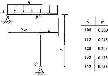 4.已知壓桿BC直徑d=10cm,l=3m,材料為木材,[σ]=10MPa,折減系數φ的值如圖表所示,a=1m,則均布荷載q的允許值最大為:![]() |