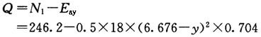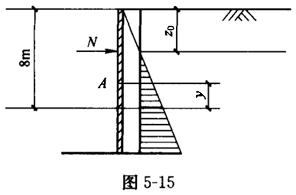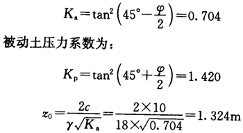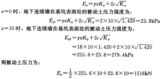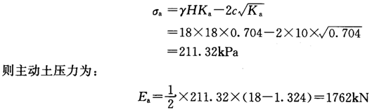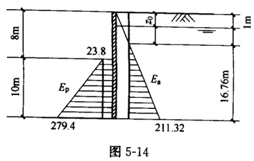 某一基坑開挖深度8m,圍護墻采用600mm厚的鋼筋混凝土地下連續墻,墻體深度為18m,支撐為一道φ500×11的鋼管支撐,支撐平面間距為3m,支撐軸線位于地面以下2m。地質條件為:地層為黏性土,土的天然重度γ=18kN/m ,內摩擦角ψ=10°,c=10kPa。地下水位在地面以下1m,不考慮地面荷載。若用朗肯土壓力理論(水土合算)和靜力平衡法進行計算,則: |