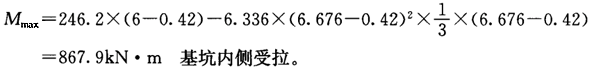 正確答案:1.B;2.B;3.A;4.C 解題思路:如下圖所示:![]() (1)主動土壓力計算:主動土壓力系數為: ![]() 墻底面處的主動土壓力強度為: ![]() 因此答案為B。 (2)被動土壓力計算: ![]() 因此答案為B。 (3)計算單根支撐的軸力(靜力平衡法):支護結構在水平方向所受的合力為0,ΣFx=0,設N為每一根支撐的軸力,因為每一根支撐要承擔3m寬的地下連續墻的土壓力,則:N+3Ep=3EaN=3(Ea-Ep)=3×(1762.2-1516)=738.6kN因此答案為A。 (4)計算地下連續墻的最大彎矩(圖5-15) ![]() 根據剪力和彎矩的關系,彎矩的極值出現在剪力為0的位置。設地下連續墻上的A點處的彎矩為0,A點在基坑底面以上y處。每米地下連續墻上由支撐提供的支撐力為:N1=N/3=738.6/3=246.2kN 由水平方向合力為0的條件,得:Q=N1-Eay其中,Q為A點的剪力,Eay為A點以上主動土壓力的合力。則: ![]() 令上式等于0,可以解出y=0.42m。則最大彎矩為: ![]() 因此答案為C。 |