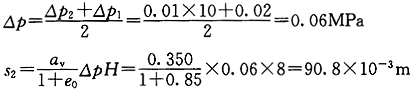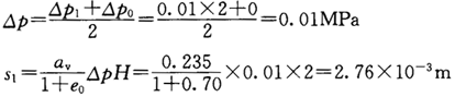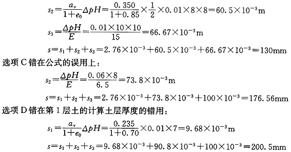 正確答案:B 解題思路:用分層總和法進行計算。黏土層和砂土層沉降量的計算公式分別為:![]() 式中 S黏、S砂-分別為黏土層和砂土層的最終沉降量(m); αv-土層的壓縮或回彈系數(MPa );△P-由于地下水位變化而施加于土層上的平均壓力(MPa); H-計算土層的厚度(m); e0-土層原始孔隙比; E-砂土層的彈性模量(MPa)。 地下水位每下降1m所對應的水壓力為 ![]() (1)計算第1層粉質黏土的沉降量: ![]() (2)計算第2層黏土的沉降量: ![]() (3)計算第3層粉細砂的沉降量: ![]() (4)計算10年后的地面總沉降量: ![]() 故選B。選項A錯在S2、S3的計算上: ![]() |