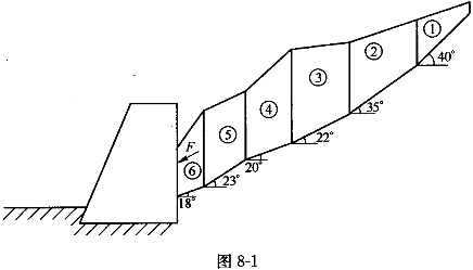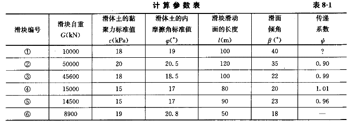 某滑坡剖面圖如圖8-1所示,取滑坡推力安全系數γ =1.15,按照《建筑地基基礎設計規范》(GB50007-2002),(計算參數見表8-1),試回答以下幾個問題:![]() 計算參數表 ![]() |
