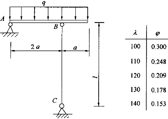 5.已知壓桿BC的直徑d=10cm,l=3m,材料為木材,[σ]=10MPa,折減系數φ的值如圖表所示,a=1m,則均布荷載q的允許值最大為:![]() |