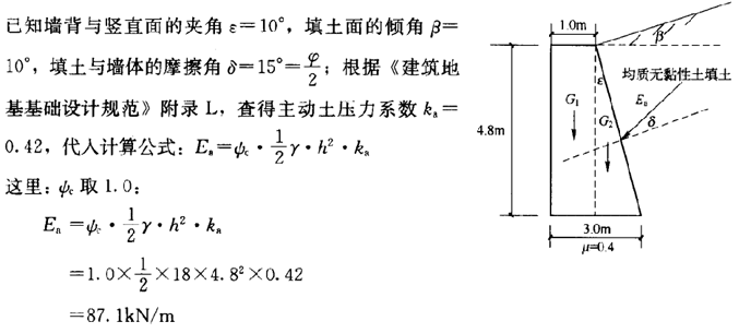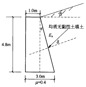 如圖所示重力式擋土墻,墻高5m,墻體砌體重度γk=22kN/m ;墻背與豎直面的夾角ε=10°,填土面的傾角β=10°,填土與墻體的摩擦角δ=15°;填土為均質(zhì)無(wú)黏性土:ψ=30°,γ=18kN/m 。設(shè)計(jì)該擋土墻。![]() |