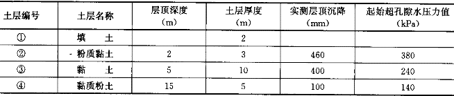 3.大面積堆載試驗時,在堆載中心點下用分層沉降儀測各土層頂面的最終沉降量和用孔隙水壓力計測得的各土層中部加載時的起始孔隙水壓力值均見下表,根據實測數據可以反算各土層的平均模量,指出第③層土的反算平均模量最接近( )。![]() |