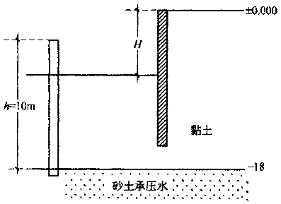 4.基坑剖面如圖所示,已知黏土飽和重度γm=20kN/m ,水的重度取γw=10kN/m ,如果要求坑底抗突涌穩定安全系數K不小于1.2,承壓水層側壓管中水頭高度為10m,則該基坑在不采取降水措施的情況下,最大開挖深度最接近( )。![]() |