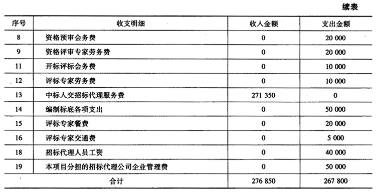 | 正確答案: (1)按取費標準,該項目的代理服務費為301500元,下浮10%后為271350元。 (2)表中計算的項目凈收益259200元是錯誤的,因為圖紙押金和投標保證金是需要退還的資金,不能計入收入;招標工作人員餐費、住宿費、通信費等已計入代理公司企業管理費,不能再計入支出。因此應從表中扣除這些支出與收入;另外代理服務費為標準下浮10%,應調整為271350元,計算表見下表。該公司的凈收益為276850-267800=9050元。 ![]() ![]() |