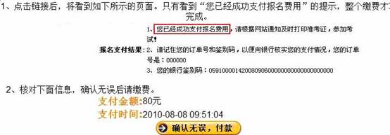 在圖8中顯示考生的訂單號和支付金額,下一步選擇考生擬使用的銀行,并點擊進入“立即支付”。銀行的支付頁面如圖9所示,成功支付頁面如圖10。