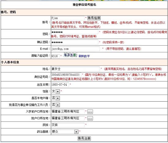 考生報名首先閱讀并遵守"事業(yè)單位招聘考試網(wǎng)管理暫行規(guī)定",并按“同意”后,方可繼續(xù)注冊報名。考生進入帳號注冊頁面,應設置帳號、密碼,并輸入個人部分基本信息(如圖3所示),取得個人帳號密碼。