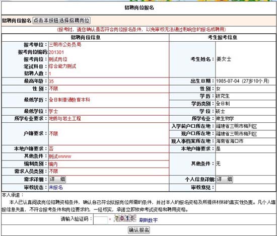 (2) 考生錄入的信息必須合法、真實、有效,不得發(fā)布違反法律法規(guī)的信息,并對本人的報名資格及所提供材料的真實性負責。凡個人填報信息失真,不符合報考條件和崗位要求的,一經(jīng)核實,應承諾立即放棄考試資格和聘用資格。