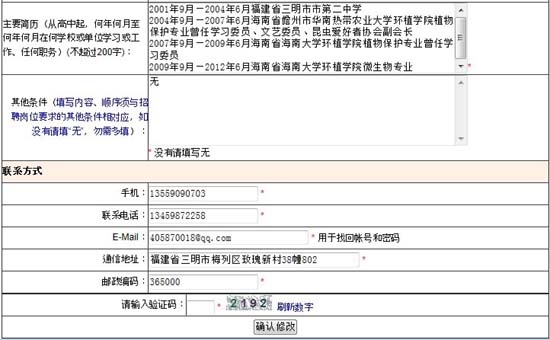 (4)在招聘單位進行資格初審前,考生可對個人信息進行修改補充,或重新選擇報考崗位。如資格初審不通過,考生可根據(jù)個人的實際情況,按照要求補充完善個人信息,重新報考該崗位,或者改報其他崗位。如果資格初審通過,考生將不可修改個人信息或重新選擇報考崗位。已經(jīng)資格初審通過的考生,如發(fā)現(xiàn)其個人輸入信息有誤,將會影響初審結(jié)果,可聯(lián)系招聘單位予以更正。