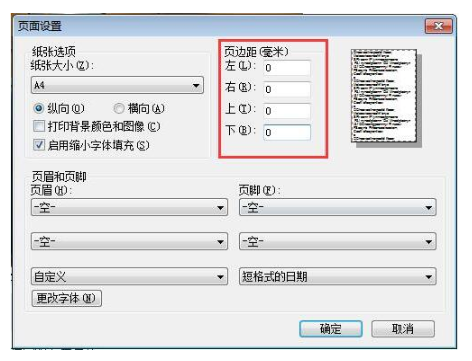 ④設(shè)置左、右、上、下頁面邊距為0.點(diǎn)擊“確定”按鈕。