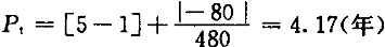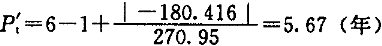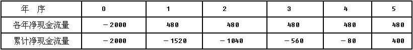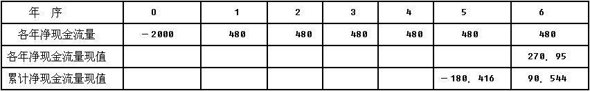 | 正確答案:B 解題思路:該題考核的是靜態(tài)投資回收期和動態(tài)投資回收期的求法,應(yīng)注意到每年的考題都涉及考核靜態(tài)投資回收期,或者與動態(tài)投資回收期一起考核,或者與凈現(xiàn)值一起考核。該題的具體求解方法為: (1)靜態(tài)投資回收期( )![]() ![]() (2)動態(tài)投資回收期( ) 根據(jù)題中給出的條件:在第5年末的累計凈現(xiàn)金流量現(xiàn)值為:NPV=-2000+480×(P/A,10%,5)=-180.416(萬元)根據(jù)題中給出的條件:在第6年末的累計凈現(xiàn)金流量現(xiàn)值為: NPV=-2000+480×(P/A,10%,6)=90.544(萬元) ![]() |