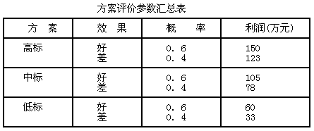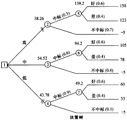 | 1.背景: 某承包商經研究決定參與某工程投標。經造價工程師估價,該工程估算成本為1500萬元,其中材料費占60%。擬議高、中、低三個報價方案的利潤率分別為10%、7%、4%,根據過去類似工程的投標經驗,相應的中標概率分別為0.3、0.6、0.9。編制投標文件的費用為5萬元。該工程業主在招標文件中明確規定采用固定總價合同。據估計,在施工過程中材料費可能平均上漲3%,其發生的概率為0.4。 問題: 該承包商應按哪個方案投標?相應的報價為多少? |